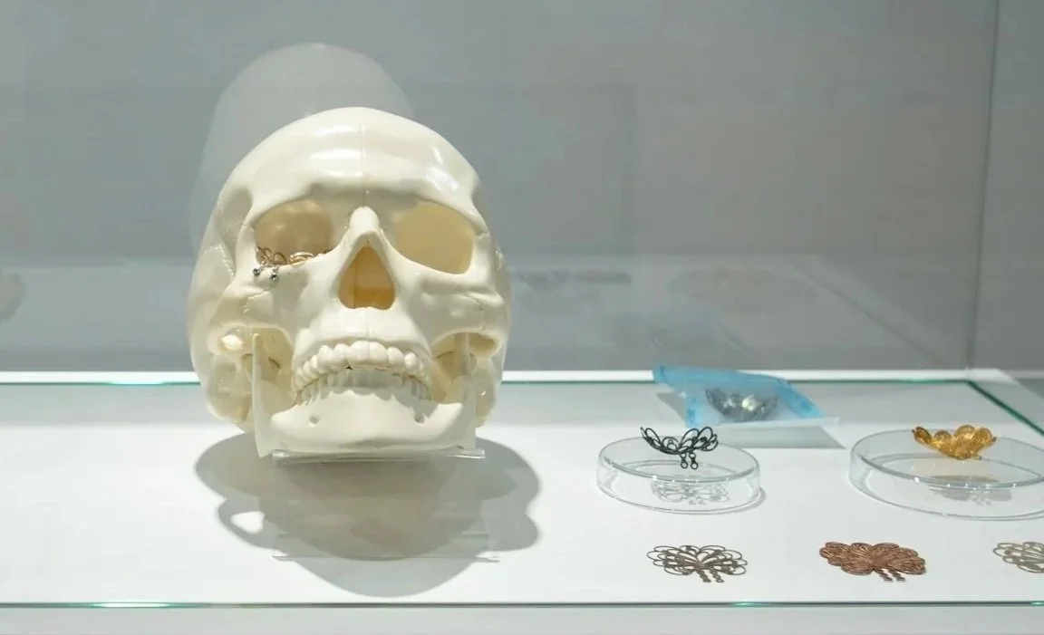 The Biofiligree project also investigates bone fixation plates for orbital cavity fractures. Moving away from conventional titanium mesh, porous polyethylene, and resorbable polymers, this project introduces designs inspired by nature, such as floral and peacock motifs. This approach seeks to soften and romanticise the gravity of facial fractures, addressing the patient’s psychological recovery. Furthermore, the concept allows for these plates to be repurposed into wearable jewellery following their removal, providing a symbolic and aesthetic afterlife for the medical device.